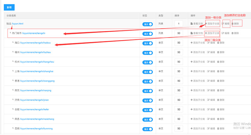 在網(wǎng)站后臺(tái)初始界面點(diǎn)擊“導(dǎo)航列表”,出現(xiàn)所有欄目的列表,然后找到“陸運(yùn)”欄目,點(diǎn)擊右側(cè)的“添加子分類”,可在“陸運(yùn)”欄目下添加二級(jí)欄目;點(diǎn)擊“熱門城市”右側(cè)的“添加子分類”,可在“熱門城市”欄目下添加三級(jí)欄目;點(diǎn)擊“編輯”可添加欄目名稱(如下圖)