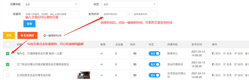 勾選文章,點(diǎn)擊“批量刪除”可以批量刪除文章;選擇時(shí)間后,點(diǎn)擊一鍵刷新時(shí)間,可更改文章發(fā)布時(shí)間;輸入關(guān)鍵詞可搜索相關(guān)文章。